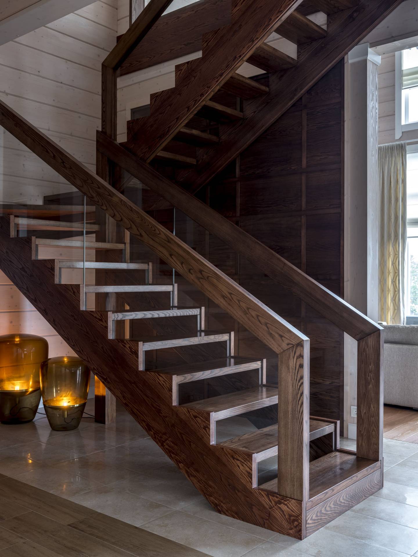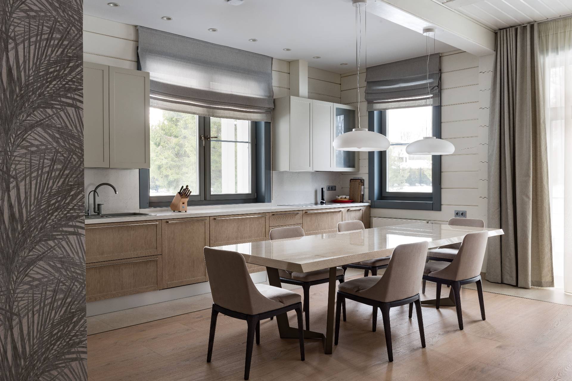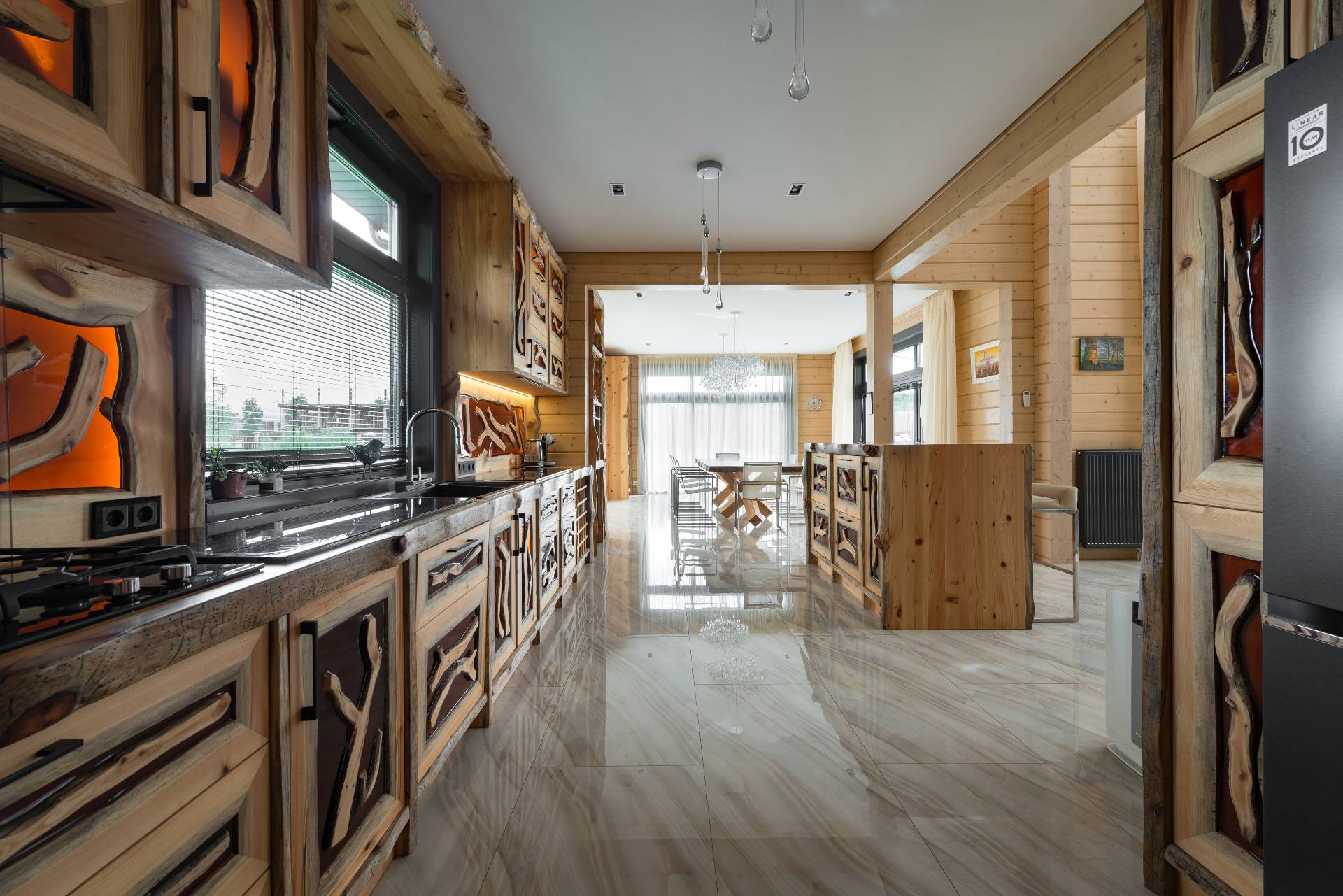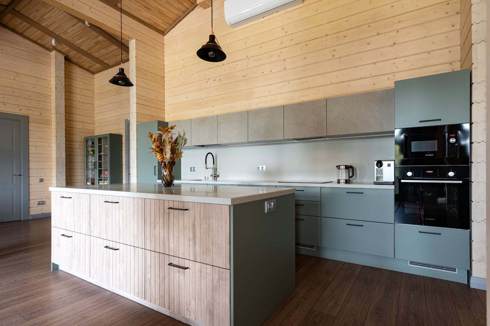 — Собственное столярное производство. Всё, что вы видите и трогаете в доме — из одного дерева, в одном ритме. Фасады, кухни, лестницы, двери, гардеробные — спроектированы и сделаны в комплексе.