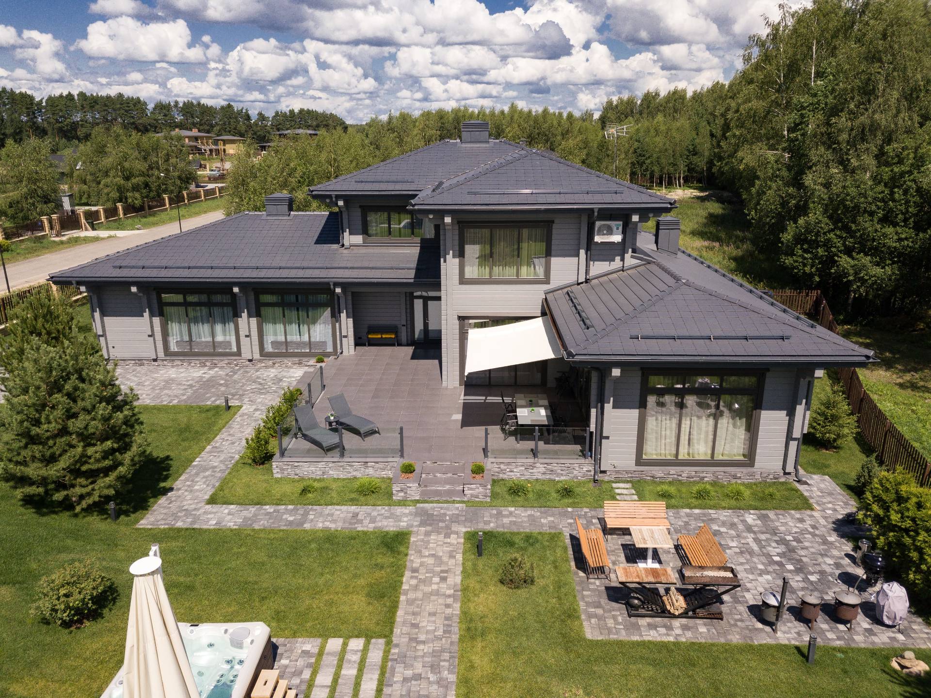 Выбираем покрытие исходя из наклона, деревьев и эстетики фасада. В основе — утеплённая конструкция (200 мм), мягкая кровля премиальных брендов (США, Финляндия), снегозадержание и металл-система водоотвода. Всё работает на срок службы и акустический комфорт.